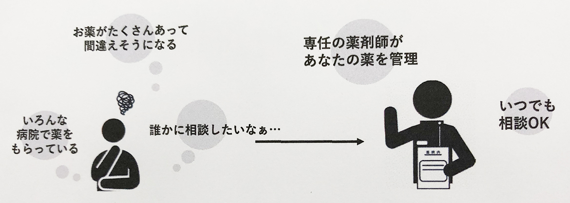 あなたが現在使用している処方薬や市販薬などの情報を把握し、薬の飲み残しや重複、副作用などがないか、1つの薬局で継続的にチェックします。